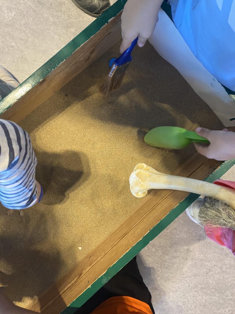 Επισκεφτήκαμε το Μουσείο Φυσικής Ιστορίας, όπου τα παιδιά εντόπισαν με ενθουσιασμό τον μπαμπά Δ., τον τελευταίο δεινόσαυρο στη γη! Εκεί ψάξανε απολιθώματα και εξοικειώθηκαν με την εργασία του παλαιοντολόγου. Χάρη στο επάγγελμά του έχουμε τόσες πληροφορίες για τα προϊστορικά ζώα σήμερα!
