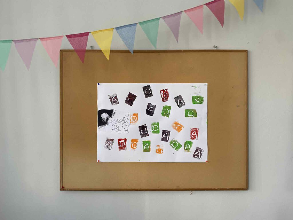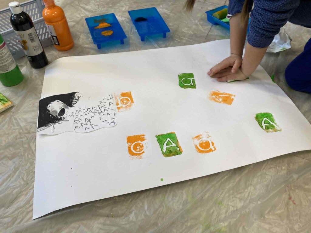 Με τα πρωτάκια, αφού γνωρίσαμε την Μιράντα και συζητήσαμε τον δικό της φόβο αλλά και τους δικούς μας βρήκαμε ευκαιρία να εξασκηθούμε στη γραφή του Αα. Το χαράξαμε πάνω σε φύλλα πολυστερίνης και κάναμε τα δικά μας χαρακτικά