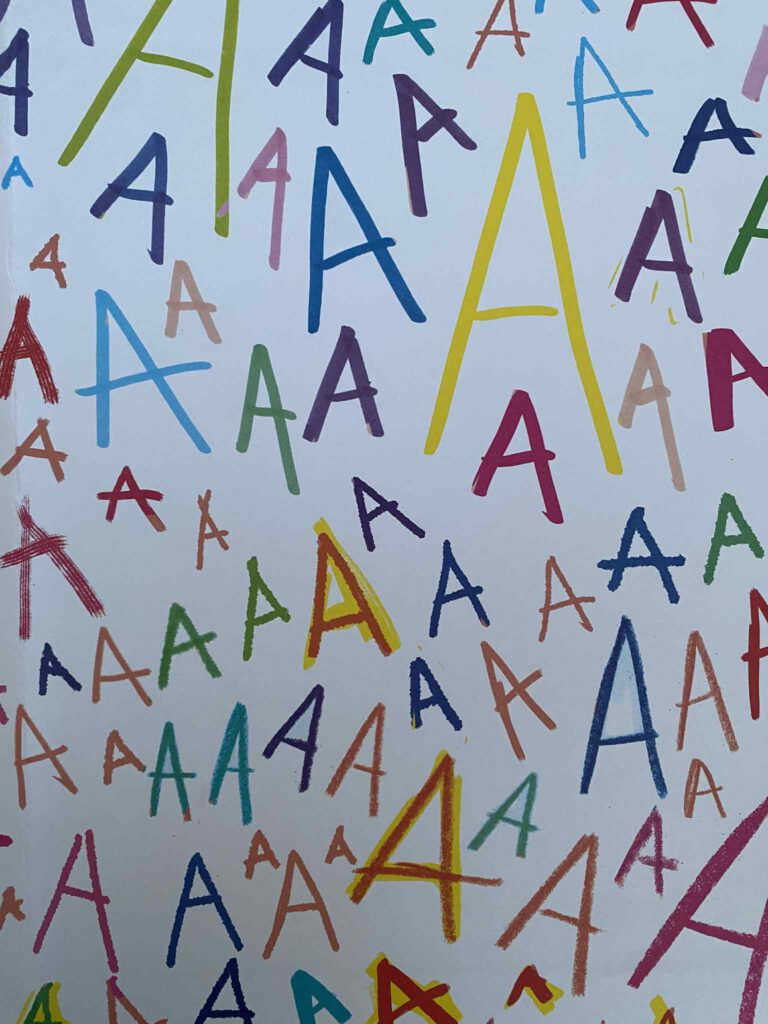 Κι αν συνήθως διαβάζουμε τα βιβλία από έξω προς τα μέσα, για το σημερινό ανατρέψαμε τις συνήθειες. Ξεκινήσαμε παρατηρώντας την ταπετσαρία του βιβλίου που είναι γεμάτη Α. Διαλέξαμε το Α το απογοητευμένο, το Α το σοκαρισμένο, το άλλο το ενθουσιασμένο μα και αυτό της ανακάλυψης. Τα φωνάξαμε όλα και μετά κλείσαμε το βιβλίο και παρατηρήσαμε το εξώφυλλο.